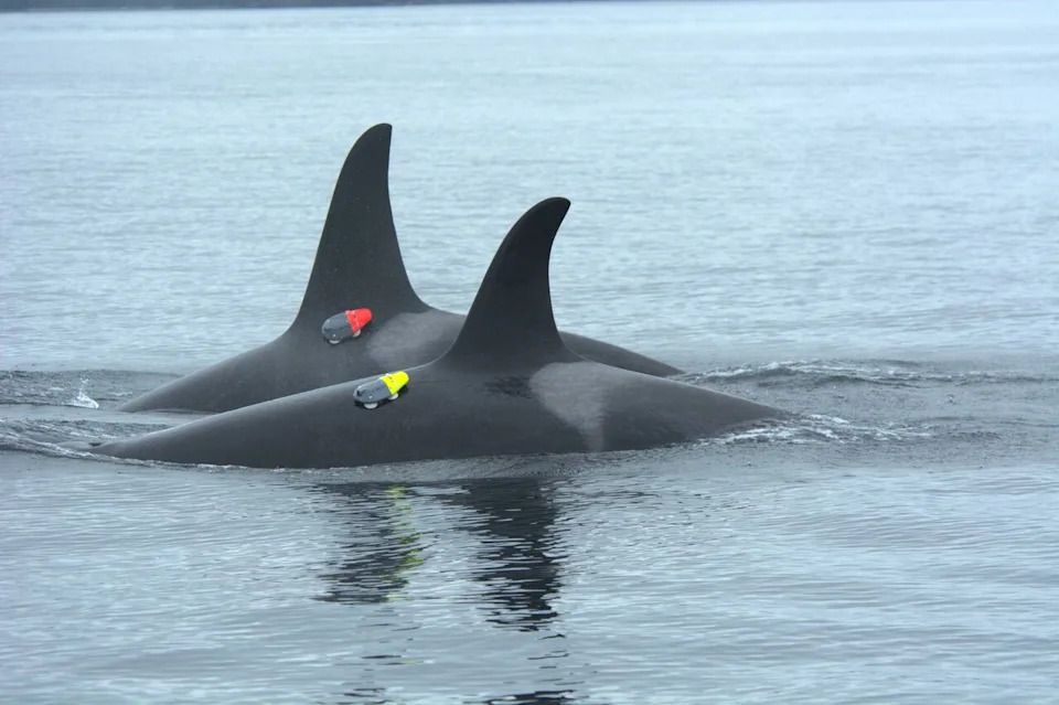 Two northern resident killer whales near Hanson Island, B.C., are seen with electronic tags planted by researchers. (Dalhousie/UBC/Hakai Institute)
