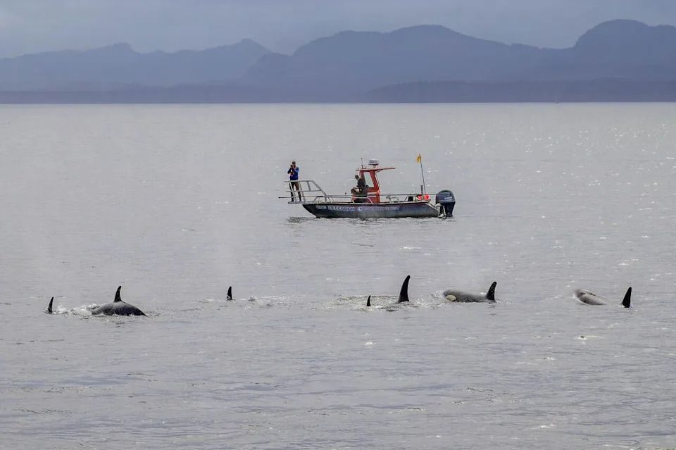 A pod of northern resident killer whales with the research vessel Steller Quest in the background. (Andrew Trites/UBC)