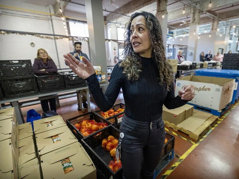 Milena Perdomo briefs volunteers at the Welcome Hall Mission in Montreal before they begin to distribute food.