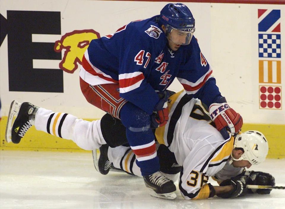 Rich Pilon (47), shown here during his time with the New York Rangers knocking the Pittsburgh Penguins' Matthew Barnaby (36) into the ice in October, 2000, wants to start a business offering horse-drawn carriage rides in Saskatoon. (Reuters)