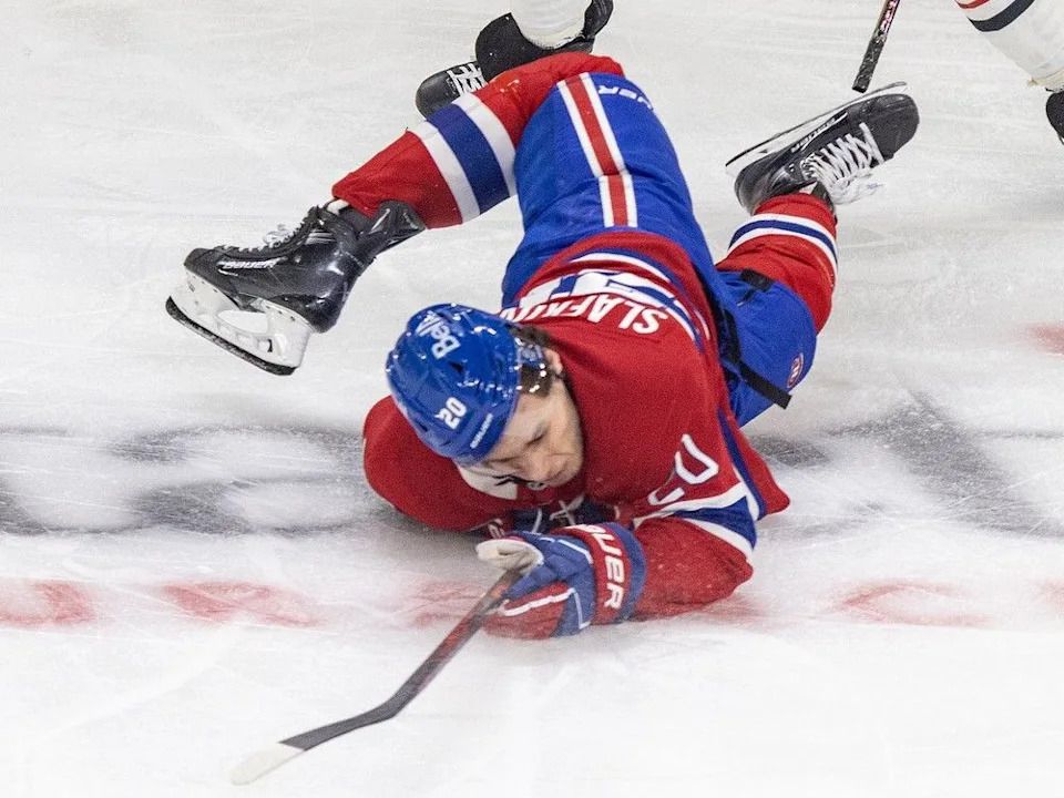 Canadiens’ Juraj Slafko0vsky hits the ice awkwardly after a check from Chicago Blackhawks’ Tyler Bertuzzi in Montreal on Thursday, Dec. 18, 2025.