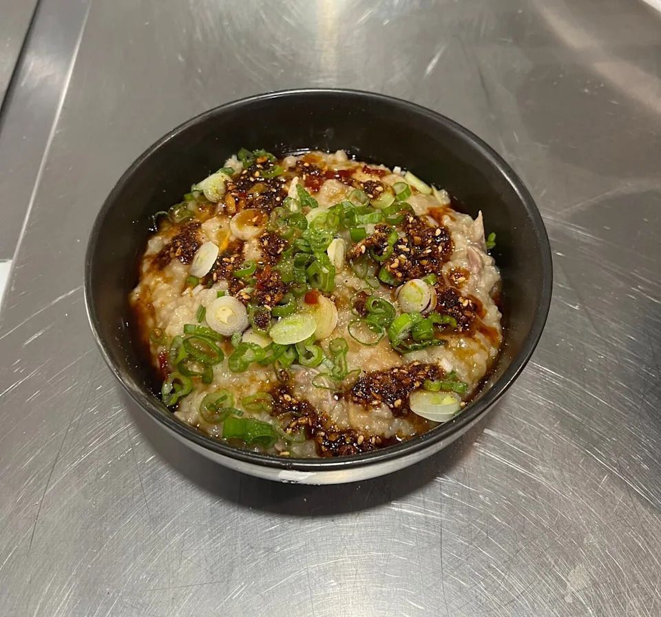 Once the porridge becomes silky, he tops it with ginger, white pepper, green onion, chili crisp and his mom’s homemade secret sauce: a combination of soy sauce, bird’s eye chili and garlic.