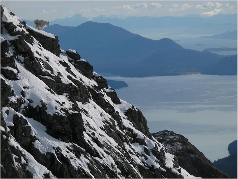 Mountain goats, their thick white coats blending in with snow-covered slopes, navigate thin ledges and steep inclines with ease.