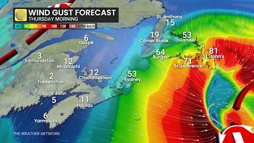 Wind gusts 70-90+ km/h are expected across the Avalon and the eastern half of the island, with the strongest gusts reserved for exposed, coastal communities.
