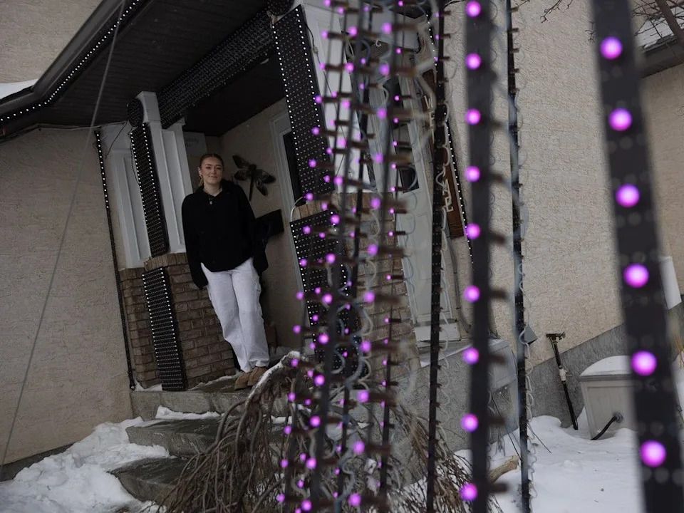 Chloe Allen stands outside her Regina home, which was decorated with lights before the recent passing of her father, Trevor.