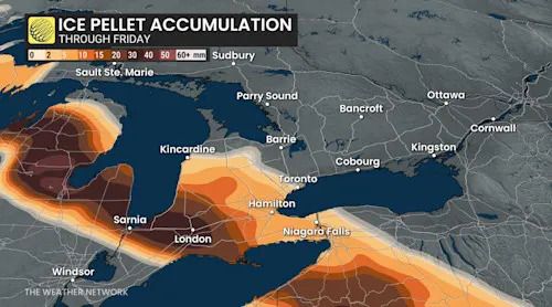 We will likely see a swath of accumulating ice pellets in southwestern Ontario around Sarnia and London through the day Friday. Residents are advised to clear ice pellet accumulations as soon as safely possible, as it can quickly freeze into a solid sheet of ice.