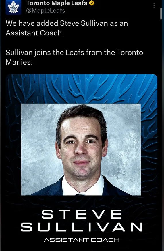 The Maple Leafs announced on Boxing Day morning that Sullivan, who had been an assistant coach with the Toronto Marlies, has been added as an assistant coach to Craig Berube’s staff.