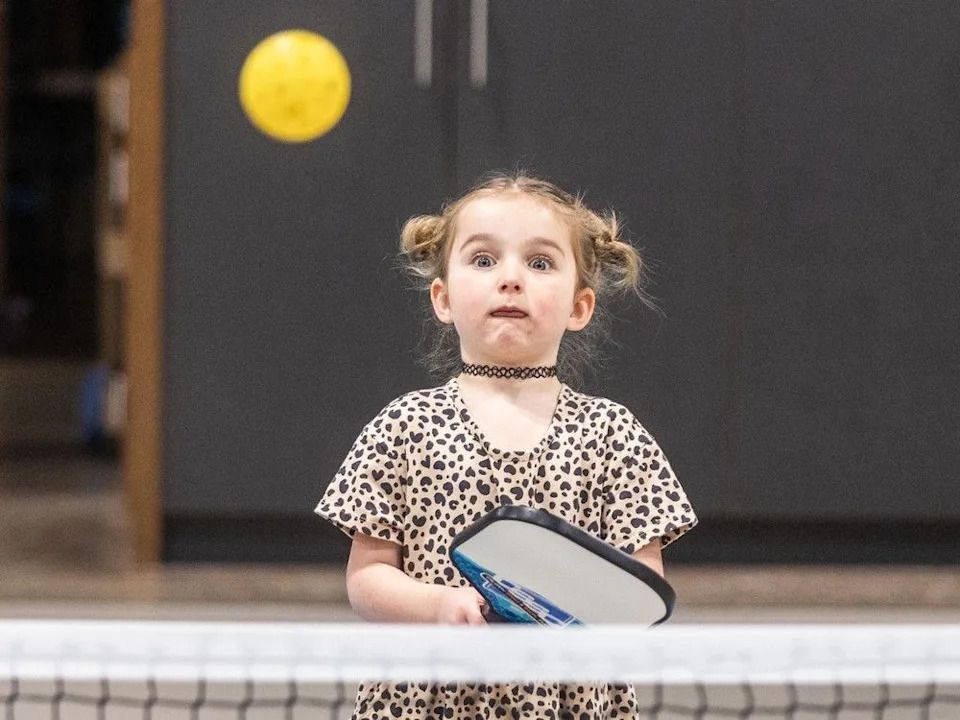 This image stands out as one of those split-second moments we might not even see with our eyes, but our camera catches the young girl’s surprise as the pickleball goes flying. Young Liv was learning to play pickleball at Fit Kids daycare on April 4, 2025.