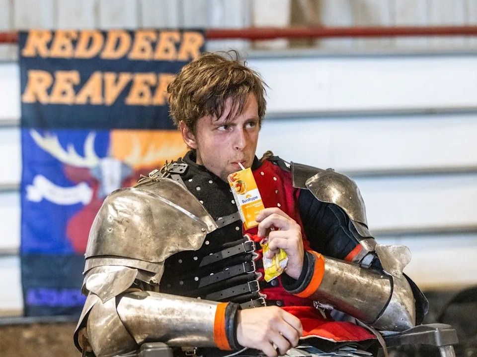 I have dozens of photographs of these fully-armoured people in combat, but the juxtaposition of the man sitting there sipping a juice box will always make me chuckle. Combatant Keston Piche was taking a break in his armour during the King’s Cup Tournament, a competition of full-contact medieval combat at the High River Medieval Faire on June 28, 2025.