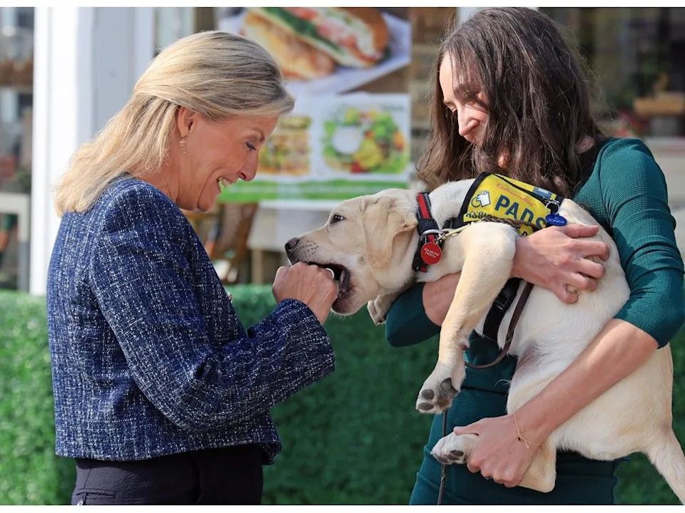 Sophie, Duchess of Edinburgh, gets a very personal greeting from puppy Jonsie and Chantel Bender with the Pacific Assistance Dogs Society at Spruce Meadows on Sept. 7, 2025. The Duchess spent several days in Calgary and at Spruce Meadows for the 50th-anniversary ‘Masters’ tournament in her role as the venue’s Royal Patron.