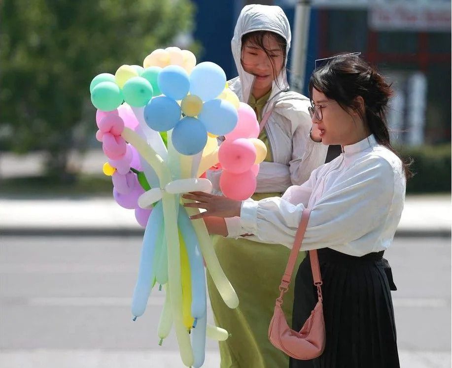 Rita Chen, left, and Hazel Ling wait for a bus on 16th Avenue N.W. near 19th Street in Calgary on June 10, 2025. The balloon bouquet will be given to a friend who is graduating.