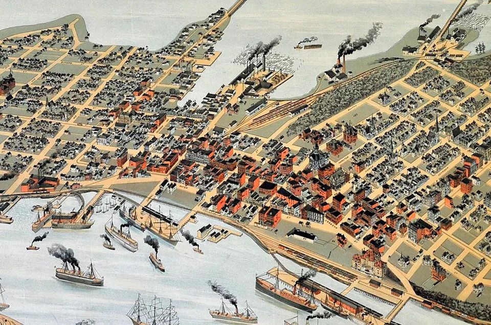 Detail from a historic bird’s-eye view map from 1898 published in the Vancouver World. This shows Gastown and its waterfront, and part of the downtown peninsula. Photographed Monday, February 28, 2011 in Vancouver, B.C. (Ian Lindsay/ PNG)