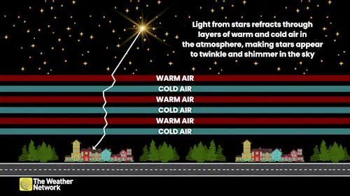 Those layers are always slightly shifting and moving around as powerful winds rush through the upper atmosphere. This turbulence means that each ray of light is taking a slightly different path to your eye, making the stars appear to twinkle and shimmer in the night sky.