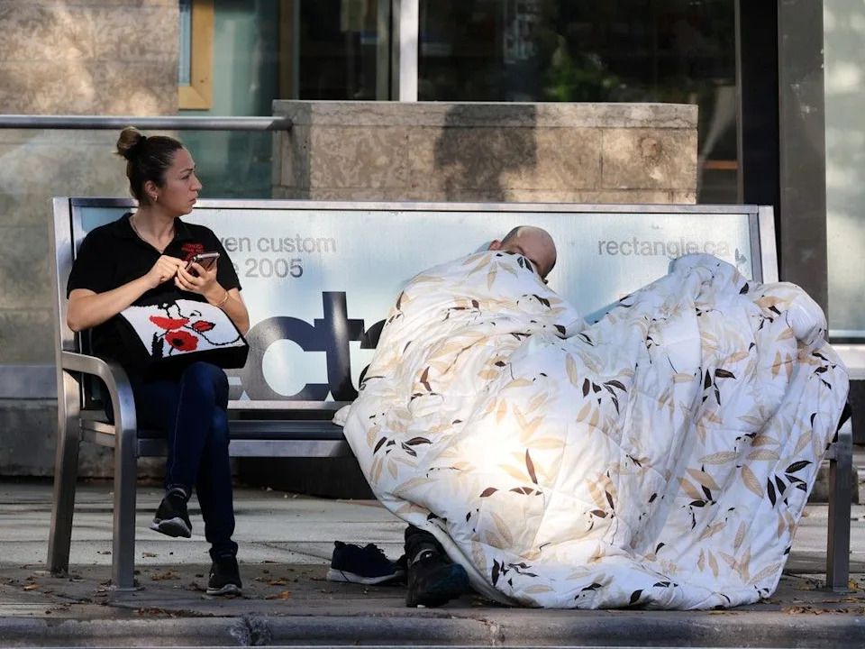 A man sleeps on a bus bench while a woman waits for a bus in Calgary’s Beltline on Thursday, Sept. 18, 2025.
