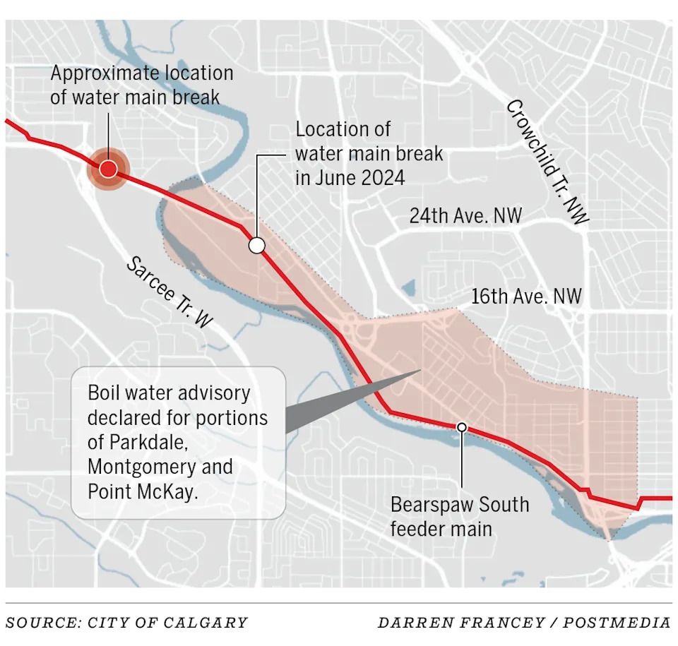 It’s the same feeder main that burst in June 2024, causing a summer-long water crisis that included citywide outdoor watering restrictions and urges from city officials to curb indoor usage to avoid straining Calgary’s water supply.