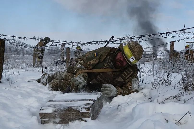 Recruits perform drills at a training ground in the Zaporizhzhia region, 1 January, 2026 - AP Photo