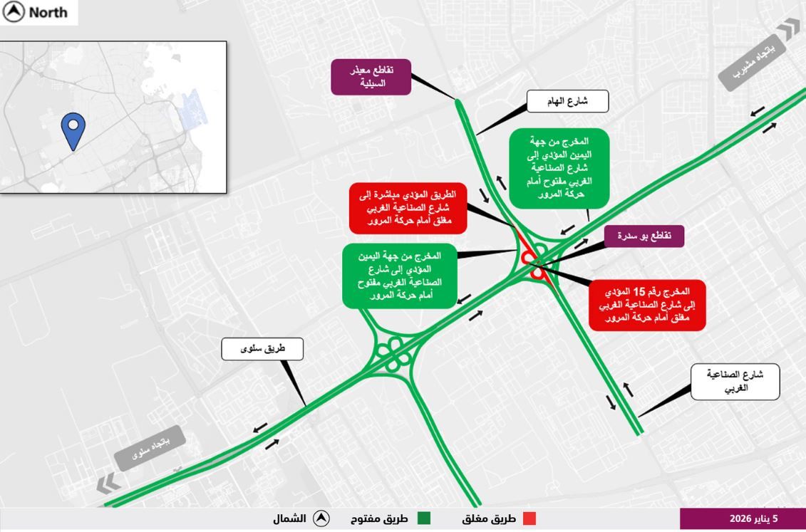 أعلنت هيئة الأشغال العامة عن إغلاق مؤقت لجزء من الطريق الخدمي لطريق المزروعة المؤدي إلى منطقة المسروحية، لمدة30 يومًا، بدءًا من صباح الأربعاء الموافق 7 يناير 2026 وحتى مساء الخميس 5 فبراير 2026، وذلك بهدف استكمال أعمال الطرق وتعزيز متطلبات السلامة المرورية.