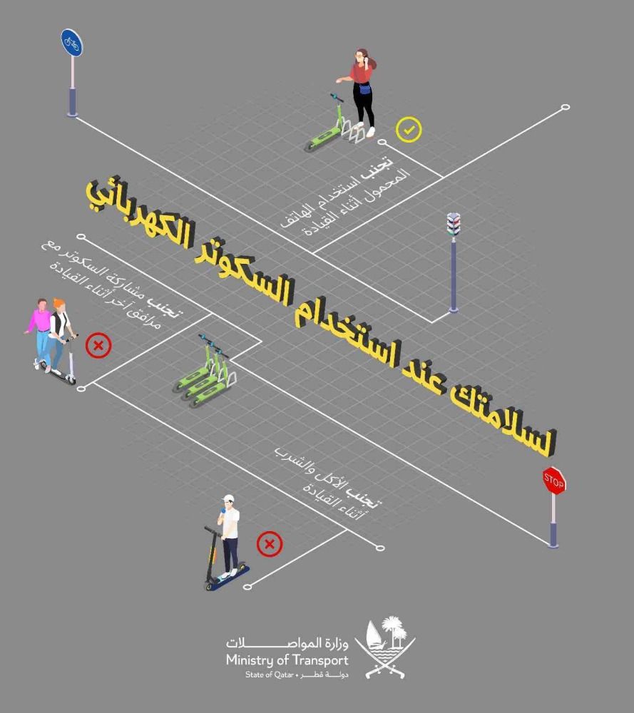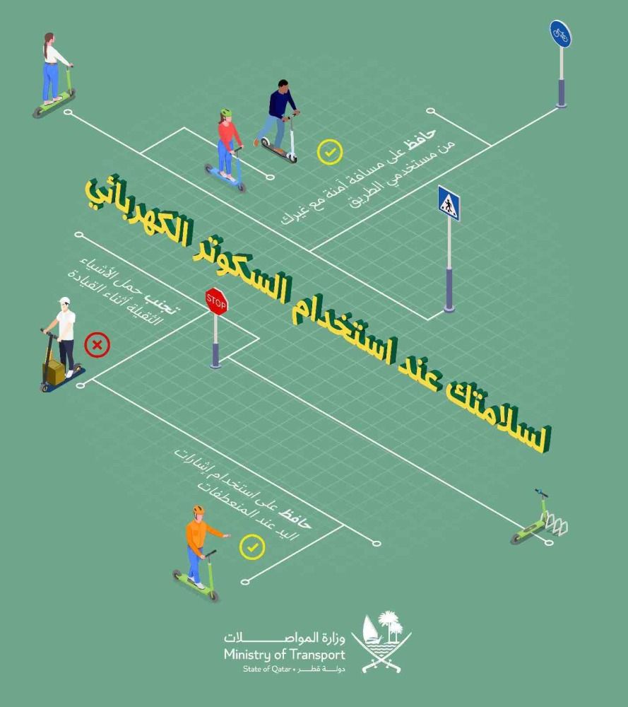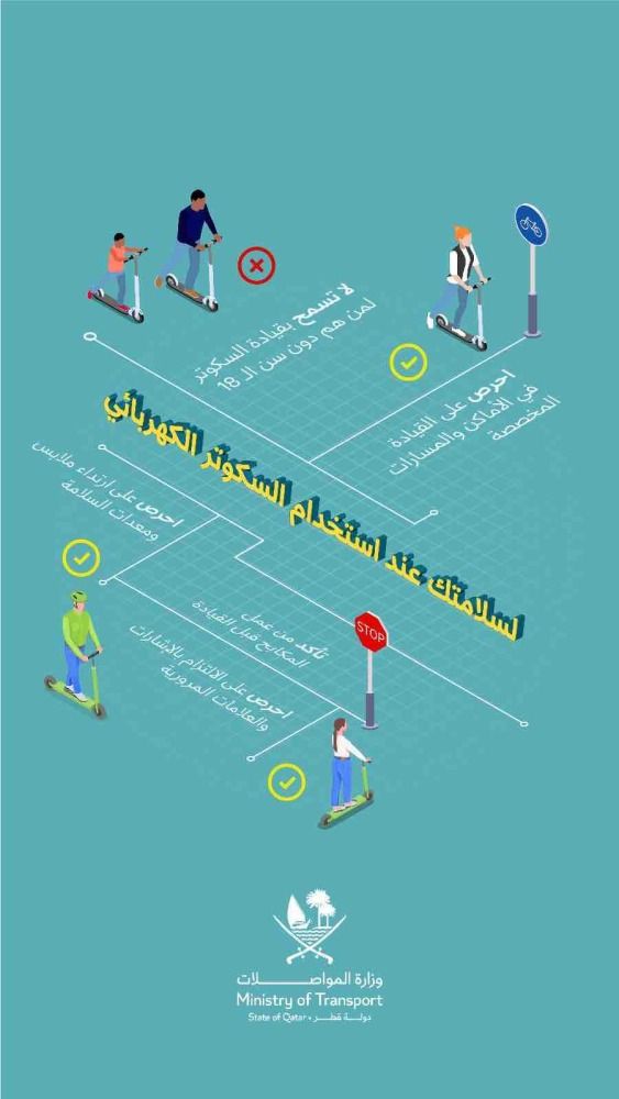 أكدت وزارة المواصلات أهمية الحرص على اتباع الإرشادات والنصائح الضرورية عند استخدام أي من وسائل التنقل المصغرة كالسكوتر الكهربائي، وذلك حفاظاً على سلامتك وسلامة الآخرين.