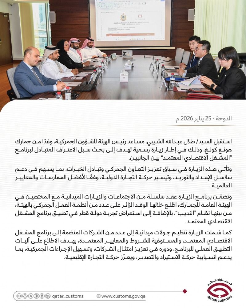 تأتي هذه الزيارة، بحسب "جمارك قطر، عبر منصة "إكس"، اليوم الأحد، في سياق تعزيز التعاون الجمركي وتبادل الخبرات بما يسهم في دعم سلاسل الإمداد والتوريد وتيسير حركة التجارة وفقاً لأفضل الممارسات والمعايير العالمية.