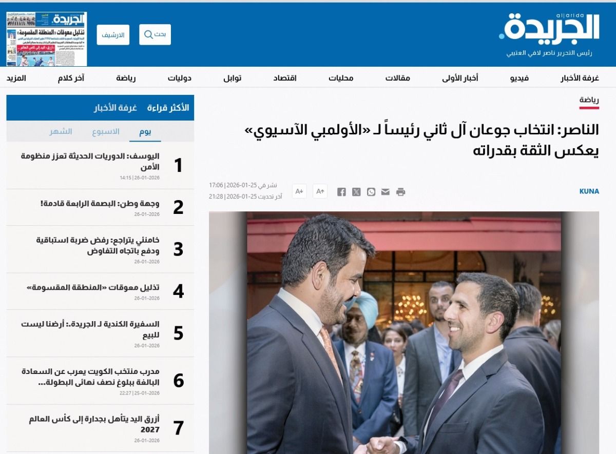 وتحت عنوان «الفيصل يهنئ جوعان برئاسة المجلس الأولمبي الآسيوي» كتبت الجريدة أن الفيصل أكد تزكية الشيخ جوعان تعكس الثقة الكبيرة التي يحظى بها على مستوى القارة الآسيوية، مشيراً إلى أهمية مواصلة العمل المشترك بين اللجان الأولمبية الوطنية، وتعزيز التعاون والتكامل بما يسهم في تطوير الرياضة الآسيوية، وتحقيق تطلعات الرياضيين، وترسيخ القيم الأولمبية، متمنياً له التوفيق والسداد في قيادة الرياضة الآسيوية خلال المرحلة المقبلة.
