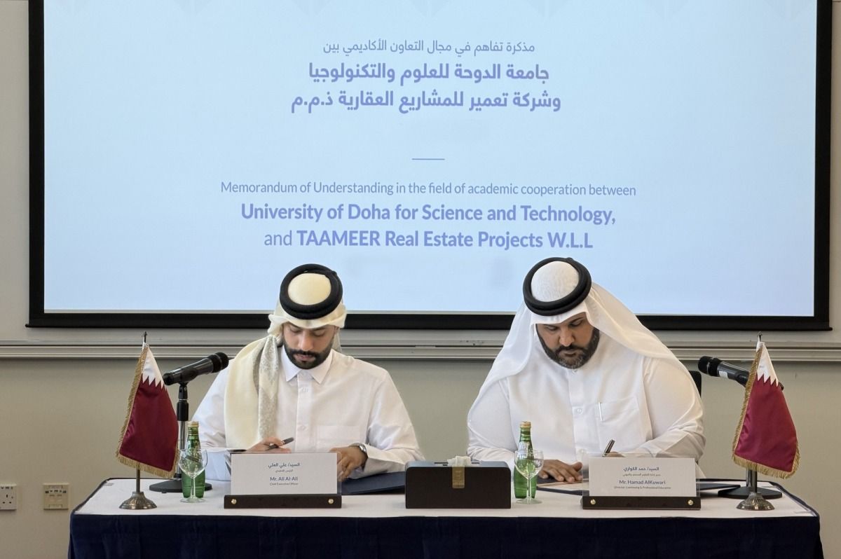 وقّعت جامعة الدوحة للعلوم والتكنولوجيا مذكرة تفاهم استراتيجية مع شركة "تعمير" للمشاريع العقارية، إحدى الشركات القطرية الرائدة في مجال التطوير العقاري لتعزيز التعاون الأكاديمي، ودعم تطوير الطلبة، وتوطيد الشراكة بين القطاعين الأكاديمي والصناعي.