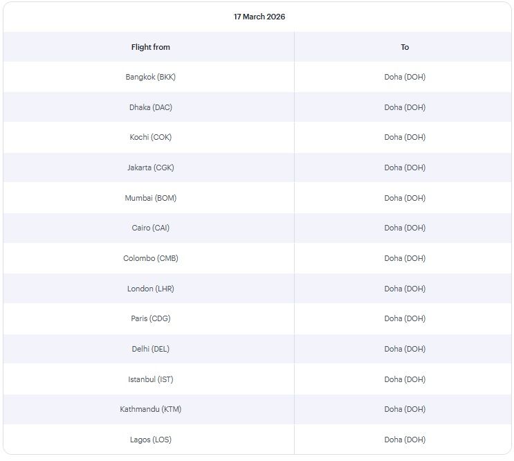 أوضحت الخطوط الجوية القطرية أنها تشغّل جدول رحلات جوية محدودة من وإلى الدوحة بينما تستمر الخطوط الجوية القطرية في تعليق رحلاتها الجوية مؤقتاً في ظل استمرار إغلاق المجال الجوي لدولة قطر
