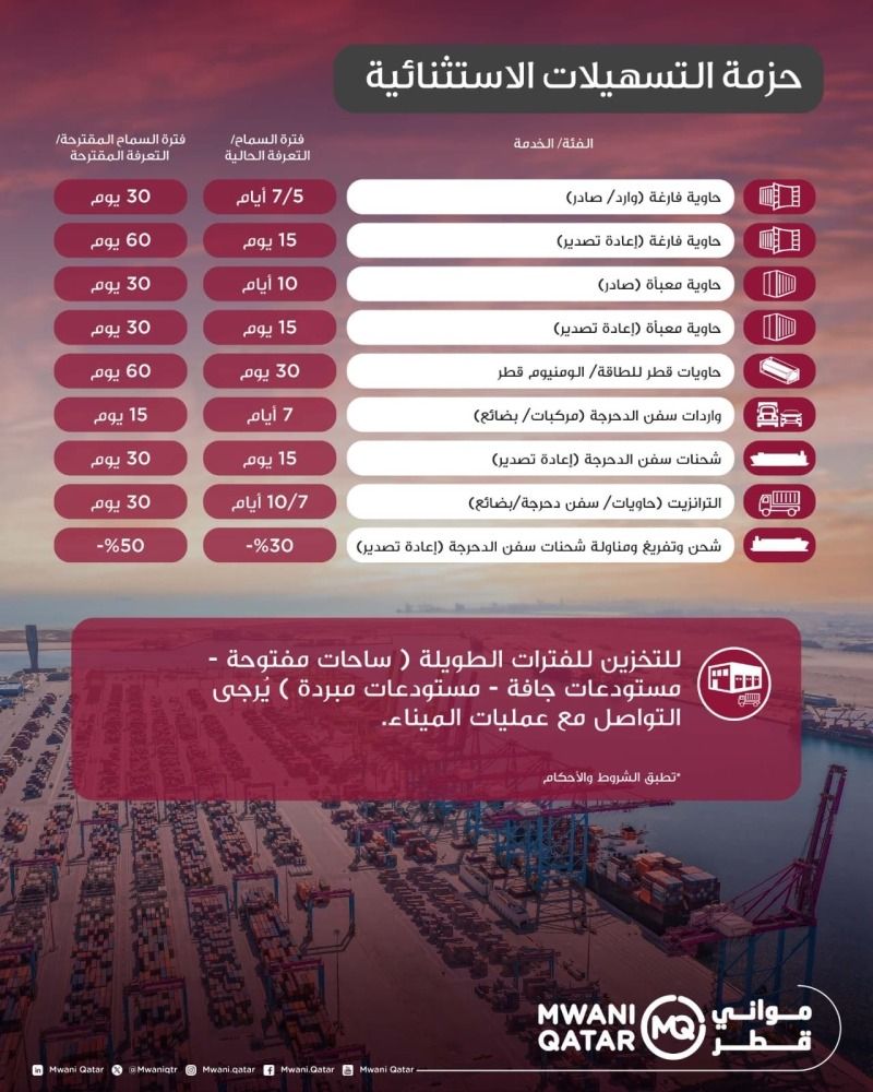 أعلنت مواني قطر عن تفعيل حزمة تسهيلات استثنائية في تعرفة الموانئ، تعزيزًا لدعم القطاع اللوجستي وتسهيل الأعمال التشغيلية في قطر، مع تركيز الحزمة على تعزيز ودعم سلاسل الإمداد والتوريد
