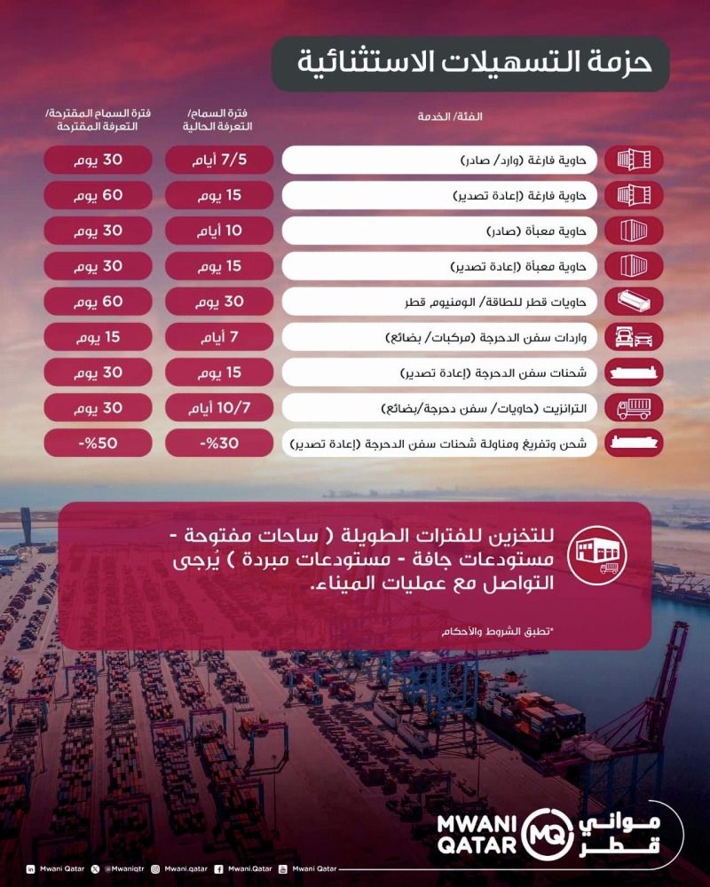 أعلنت الشركة القطرية لإدارة الموانئ «مواني قطر» تفعيل حزمة تسهيلات استثنائية في تعرفة المواني؛ تعزيزاً لدعم القطاع اللوجستي، وتسهيلاً للأعمال التشغيلية في قطر، مع تركيز الحزمة على تعزيز ودعم سلاسل الإمداد والتوريد. ونوهت في بيان صادر أمس بأنها اتخذت ذلك القرار نظراً للظروف الراهنة التي أثرت على سلاسل الإمداد والتوريد، وما نتج عنها من تحديات تشغيلية ولوجستية. وتهدف التسهيلات إلى تخفيف الأعباء المالية عن العملاء، وتوفير خيارات تخزين مناسبة ومرنة تلبي احتياجات مختلف القطاعات، وضمان استمرار عمليات الاستيراد والتصدير وسلاسل التوريد خلال تلك المرحلة الحرجة.
