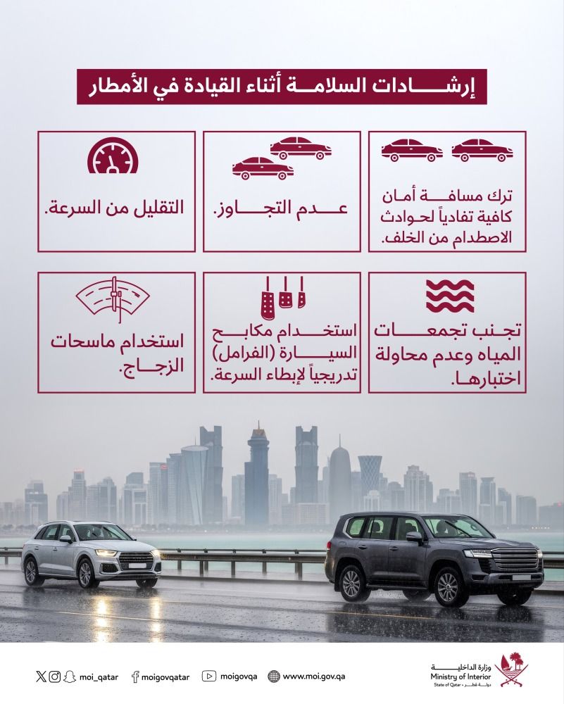 أكدت وزارة الداخلية ضرورة اتباع إرشادات السلامة لقيادة آمنة أثناء المطر، ومنها ترك مسافة آمنة والتقليل من السرعة، فيما طالبت إدارة الأرصاد الجوية بتوخي الحذر مع استمرار رصد الأمطار الرعدية التي تشهدها البلاد.