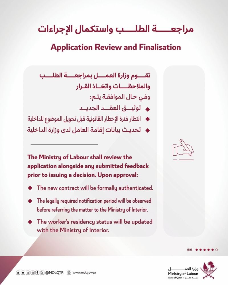 تقوم وزارة العمل بمراجعة الطلب والملاحظات واتخاذ القرار وفي حال الموافقة يتم: