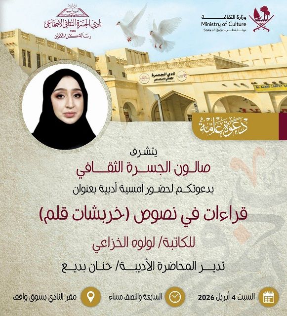 ومن المنتظر أن تشهد الأمسية حضورًا من المهتمين بالشأن الثقافي والأدبي، إلى جانب نخبة من الكتّاب والمثقفين، في إطار حوار مفتوح يثري النقاش حول التجربة الإبداعية للكاتبة لولوه الخزاعي، ويتيح للجمهور التفاعل المباشر معها.