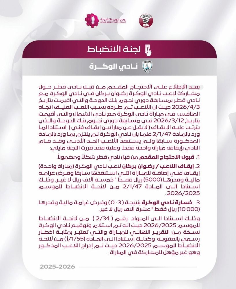 ولعل القطرة التي أفاضت الكأس وزادت الطينة بلة هو قضية سحب النقاط من نادي الوكرة بسبب مشاركة اللاعب رضوان بركان ضد نادي قطر وهو الموقوف تلقائيا بسبب اللعب العنيف تجاه المنافس في مباراة الوكرة مع الشمال والتي أقيمت بتاريخ 12 مارس في مسابقة دوري نجوم بنك الدوحة والذي ترتب عليه الإيقاف (لا يقل عن مباراتين إيقافا فنيا) استناداً لما ورد بالمادة 47/1/2، علماً بأن نادي الوكرة لم يلتزم بما ورد بالمادة المذكورة سابقاً ولم يستنفد اللاعب الحد الأدنى وقد قام النادي بإيقافه مباراة واحدة فقط، وهو ما جعل لجنة الانضباط باتحاد الكرة تقبل احتجاج نادي قطر شكلاً ومضموناً، واعتبرت نادي الوكرة خاسرا بنتيجة (3-0) وفرض غرامة مالية وقدرها(10.000) ريال فقط "عشرة آلاف ريال لا غير"، وذلك استناداً للمواد رقم ( 34/2 ) من لائحة الانضباط.