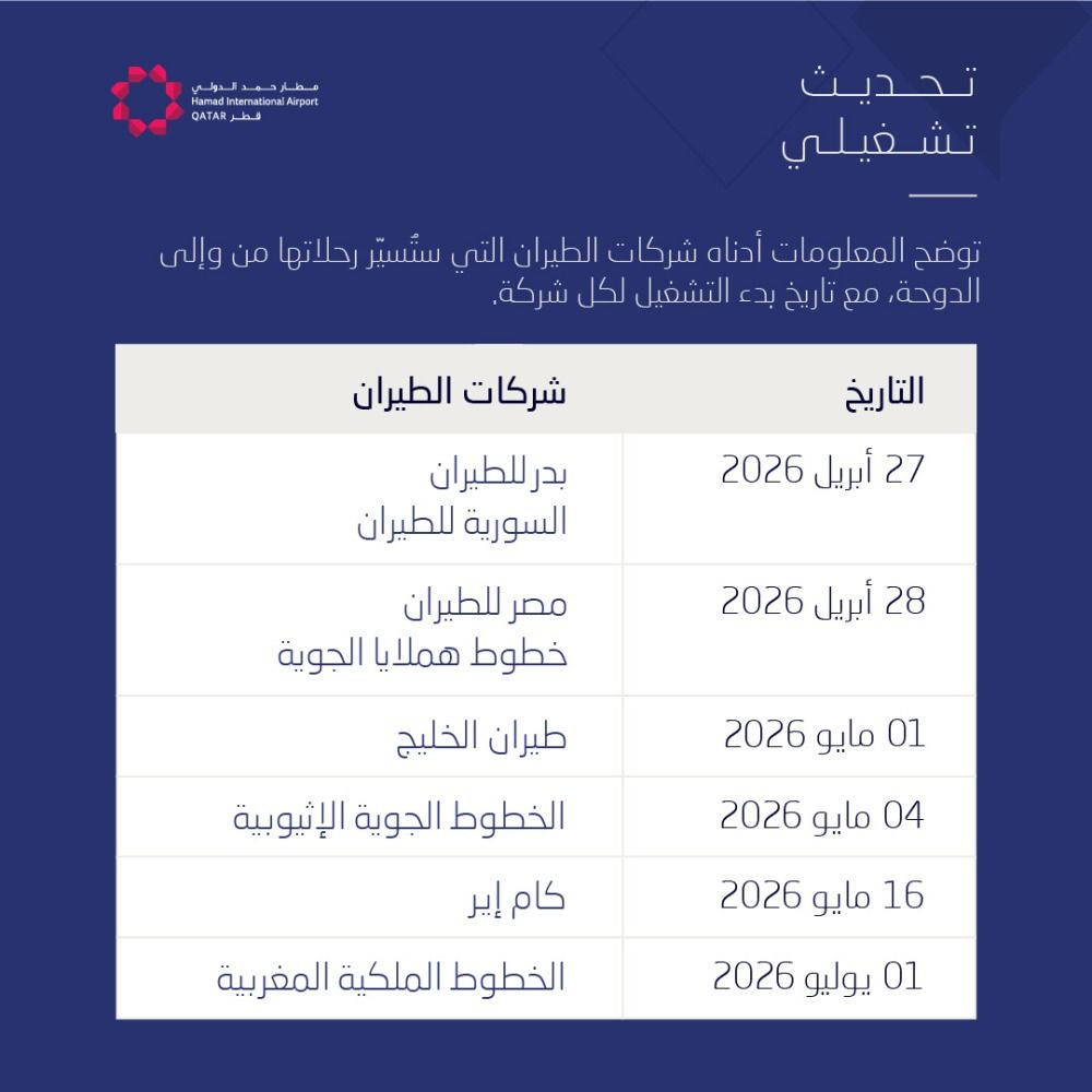 ودعا المطار المسافرين إلى التواصل مباشرة مع شركات الطيران للحجز والاستعلام عن جداول الرحلات.