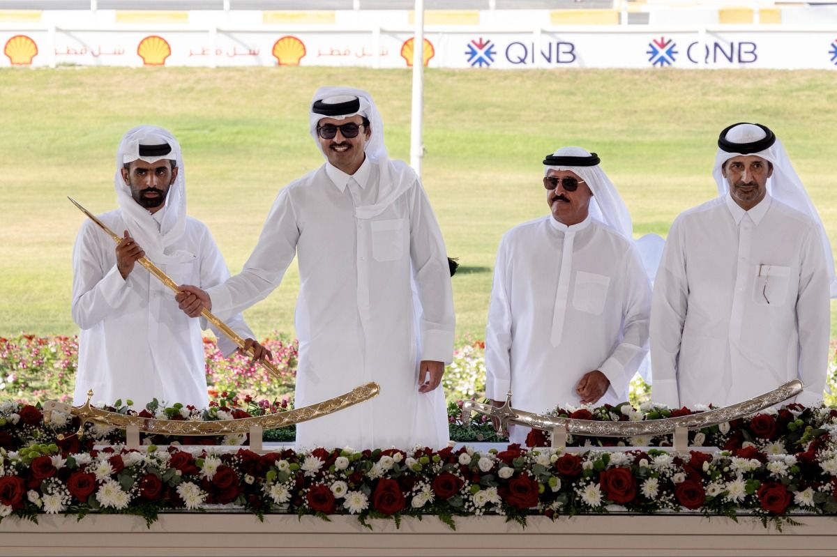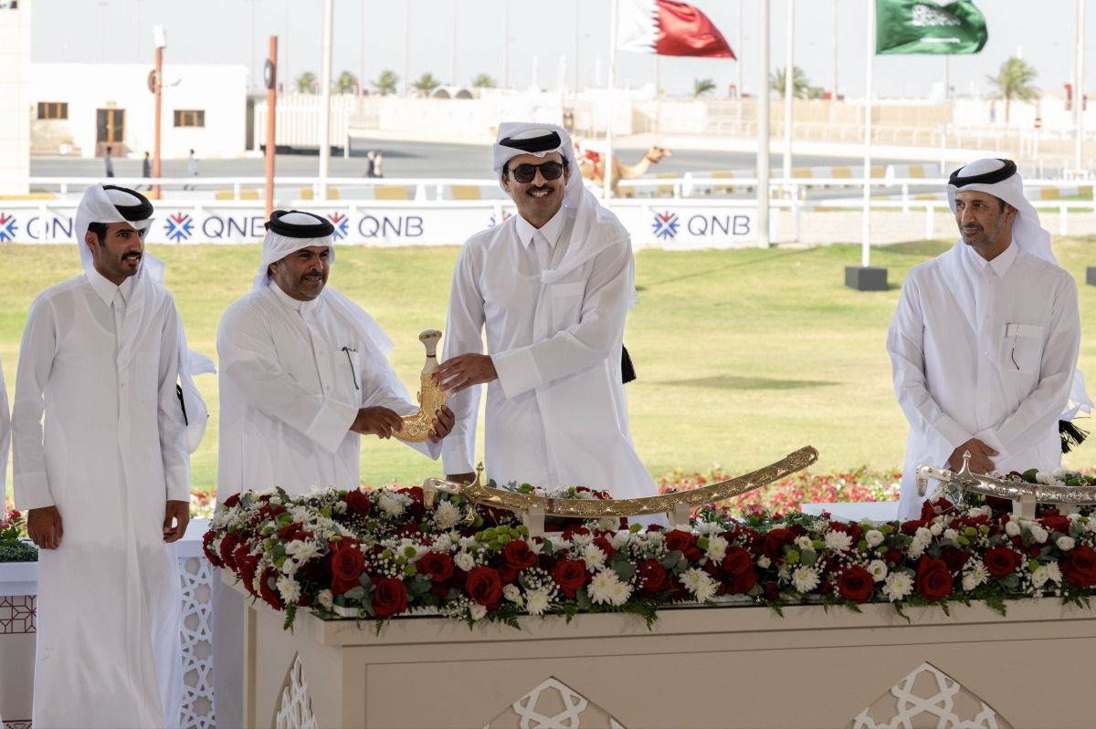 شهد حضرة صاحب السمو الشيخ تميم بن حمد آل ثاني أمير البلاد المفدى، الأشواط الختامية في المهرجان السنوي لسباق الهجن العربية الأصيلة على سيف سموه للموسم (2025-2026)، التي أقيمت بمضمار الشيحانية، عصر اليوم.