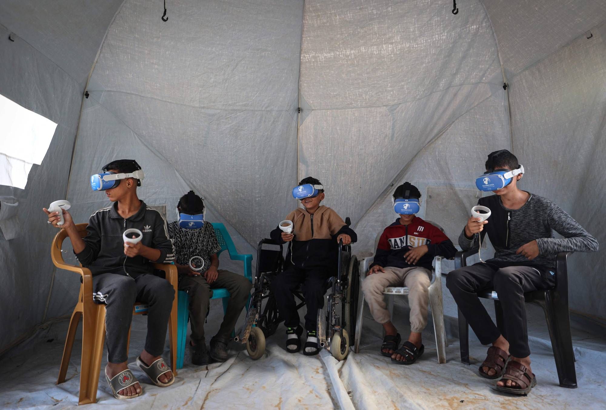 يجلس أحد الأطفال على كرسي متحرك فيما يجلس الآخرون على كراسي بلاستيكية، ويحرّكون رؤوسهم لاستكشاف عالم جديد كامن داخل الخوذ ويعبرون خلاله إلى حدائق خضراء وشواطئ هادئة ومدن آمنة.