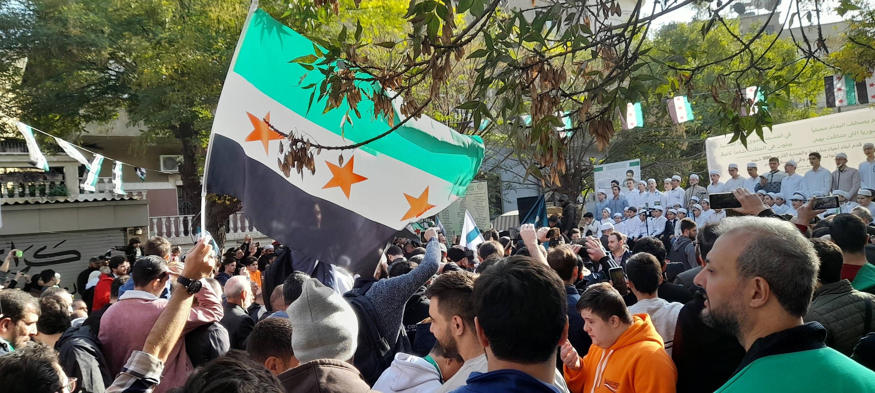 وتكتظ شوارع دمشق بالمحتفلين الذين يرفعون الأعلام الوطنية، صغاراً وكباراً، رجالاً ونساء، ويلوحون بها في مواكب سيارة ينشدون لسوريا، إضافة إلى مواكب سيارة لشركات صناعية توزع الهدايا المغلفة بالعلم، بينما تصدح مكبرات الصوت بأغاني الثورة السورية.