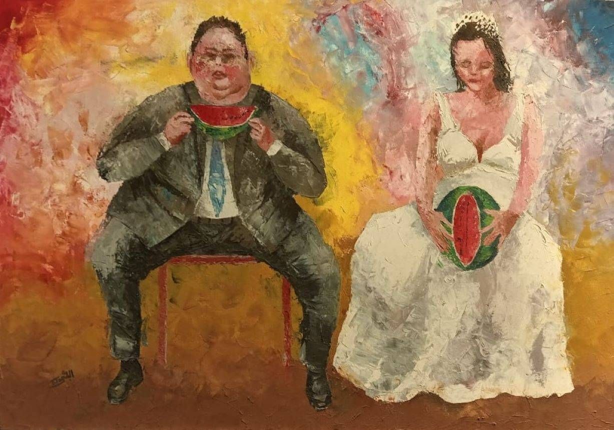 ويوضح: «إن البهجة الزائفة التي ينبهر بها المتلقي في الوهلة الأولى لمشاهدته اللوحات بسبب اللون والضوء على وجه الخصوص سرعان ما يكتشف أنها وهمية حين يتعمق في تأمل اللوحات، ويكتشف كم الصراع بين العروسين، بمعنى أنها إسقاط على حالة الانبهار التي تصيب البعض تجاه المظاهر الخادعة أحياناً، ويتم الاختيار والزواج بناءً عليها».