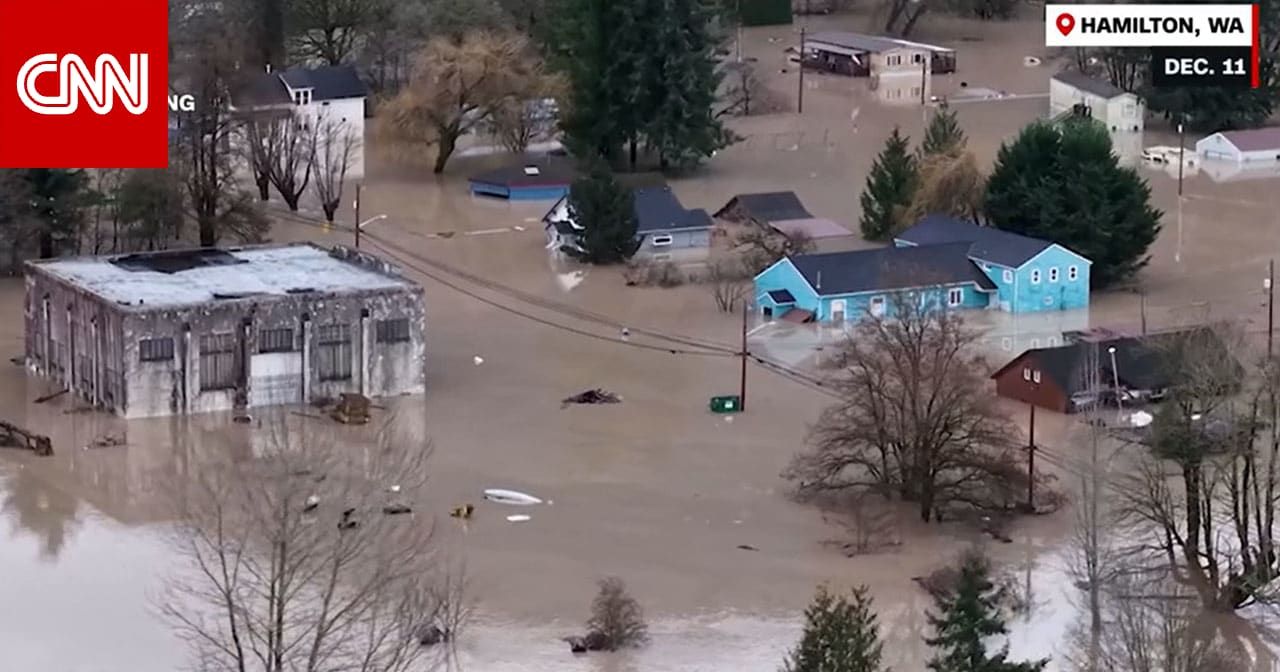والتقطت طائرات بدون طيار فيضانات وصلت إلى سقف منازل في منطقة هاميلتون بولاية واشنطن.