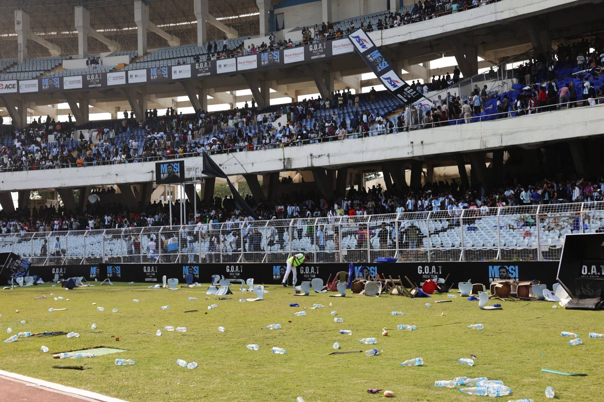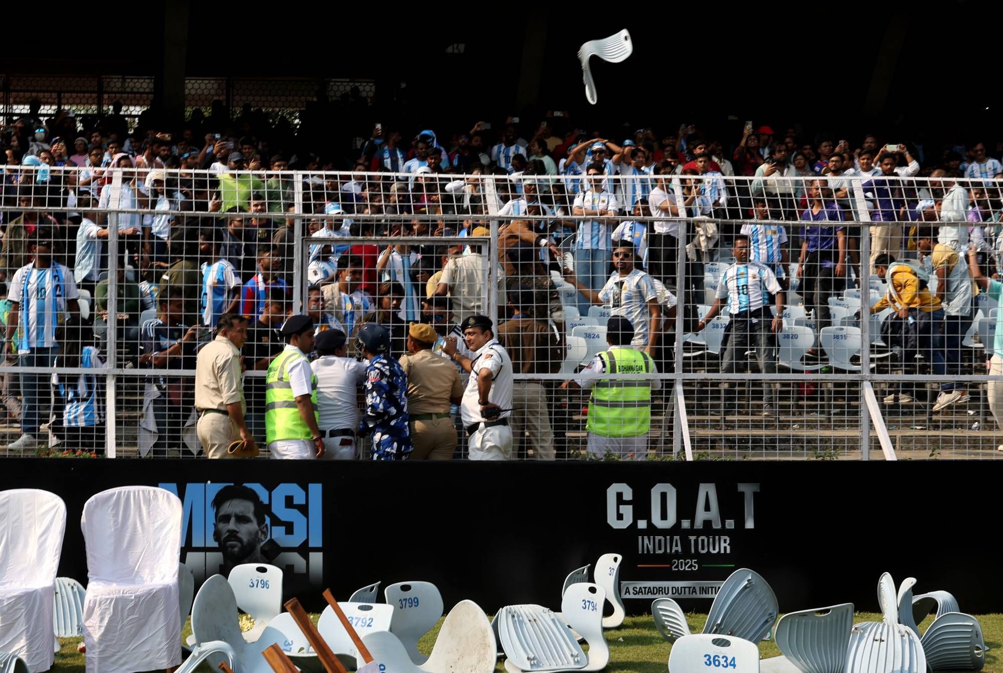 اخبار العرب -كندا 24: السبت 13 ديسمبر 2025 05:27 صباحاً قالت وكالة «إيه إن آي» الهندية للأنباء إن جولة النجم الأرجنتيني ليونيل ميسي في البلاد بدأت اليوم (السبت)، بفوضى عارمة عندما خلع مشجعون مقاعد ممزقة وألقوا بها للملعب، بعد زيارة قصيرة لمهاجم منتخب الأرجنتين وإنتر ميامي إلى استاد سولت ليك في كولكاتا.