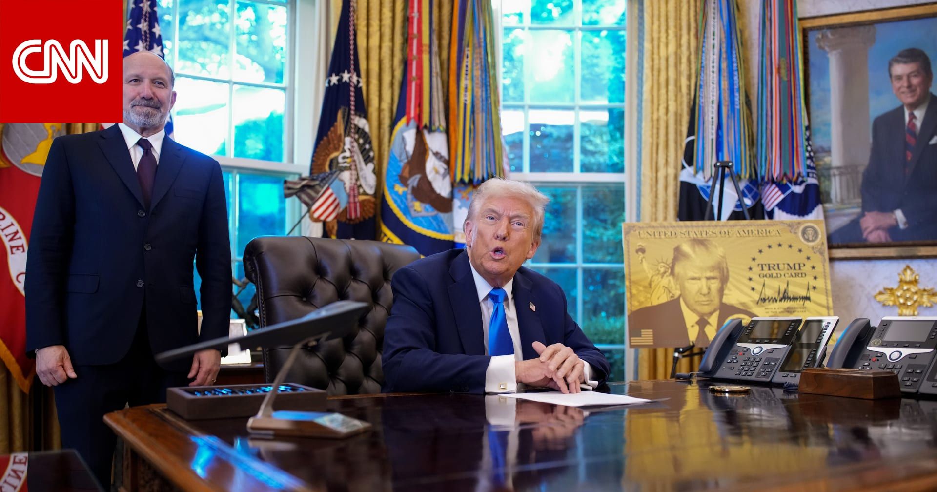ثم التفت ترامب إلى الرؤساء التنفيذيين لشركات الرعاية الصحية الواقفين خلفه، قائلاً إنهم سيُقدّرون تأشيرة "البطاقة الذهبية"، التي تسمح للأجانب بدفع مليون دولار لتسريع إجراءات طلب التأشيرة، أو أن تدفع الشركات مليوني دولار لرعاية عامل أجنبي ترغب في استقدامه إلى الولايات المتحدة.