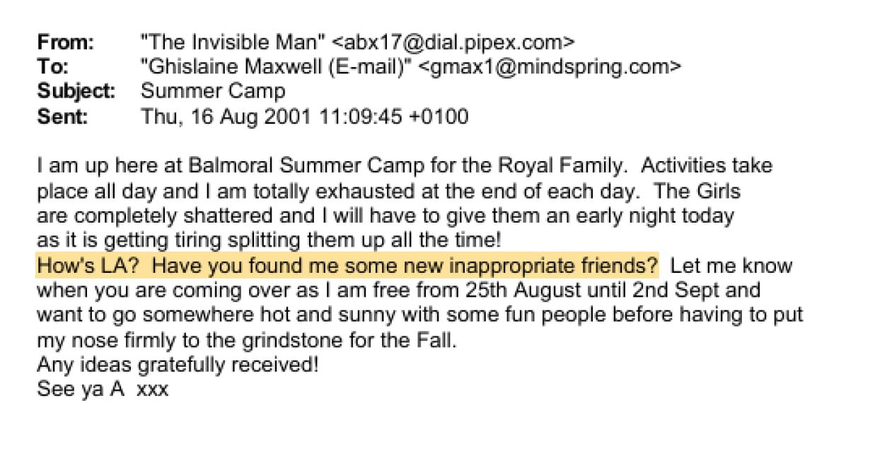 - في سلسلة من رسائل البريد الإلكتروني من عام 2001، تتواصل ماكسويل مع شخصٍ يُعرف باسم "أ" ويبدو أنه على صلة بالعائلة المالكة البريطانية. في إحدى الرسائل، يسأل "أ" ماكسويل عما إذا كانت قد "وجدت لي بعض الأصدقاء الجدد غير اللائقين".