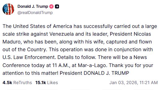 وأضاف: «نُفّذت هذه العملية بالتنسيق مع أجهزة إنفاذ القانون الأميركية. سيتم نشر التفاصيل لاحقاً. سيعقد مؤتمر صحفي اليوم الساعة 11 صباحاً في منتجع مارالاغو. شكراً لاهتمامكم بهذا الأمر!».