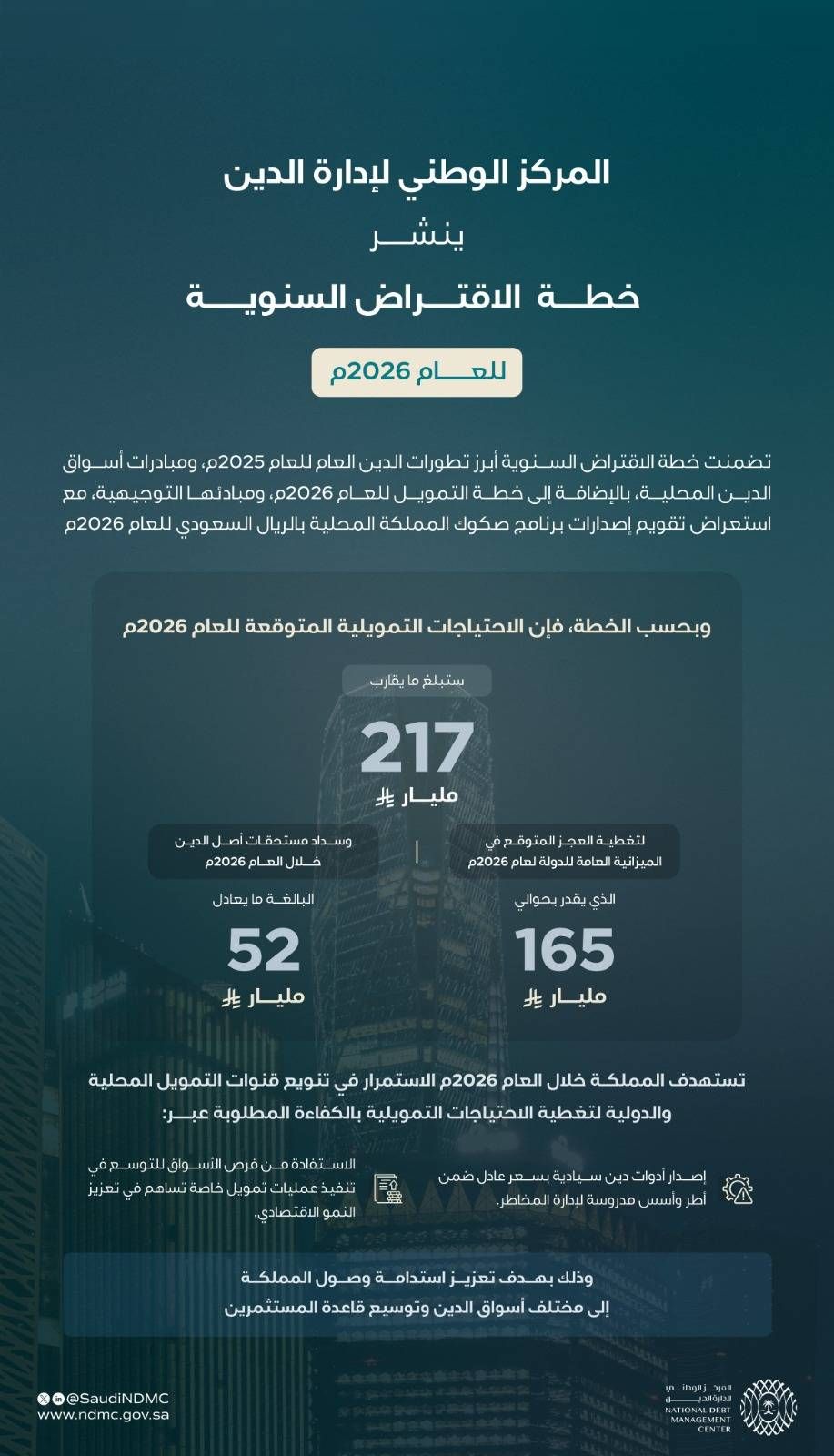 وكان وزير المالية السعودي محمد الجدعان قد وافق الأسبوع الماضي على خطة اقتراض لعام 2026 بنحو 57.8 مليار دولار، لتغطية عجز موازنة العام المالي 2026 البالغ قرابة 44 مليار دولار، إضافة إلى سداد نحو 13.9 مليار دولار من أصل الدين المستحق خلال العام.