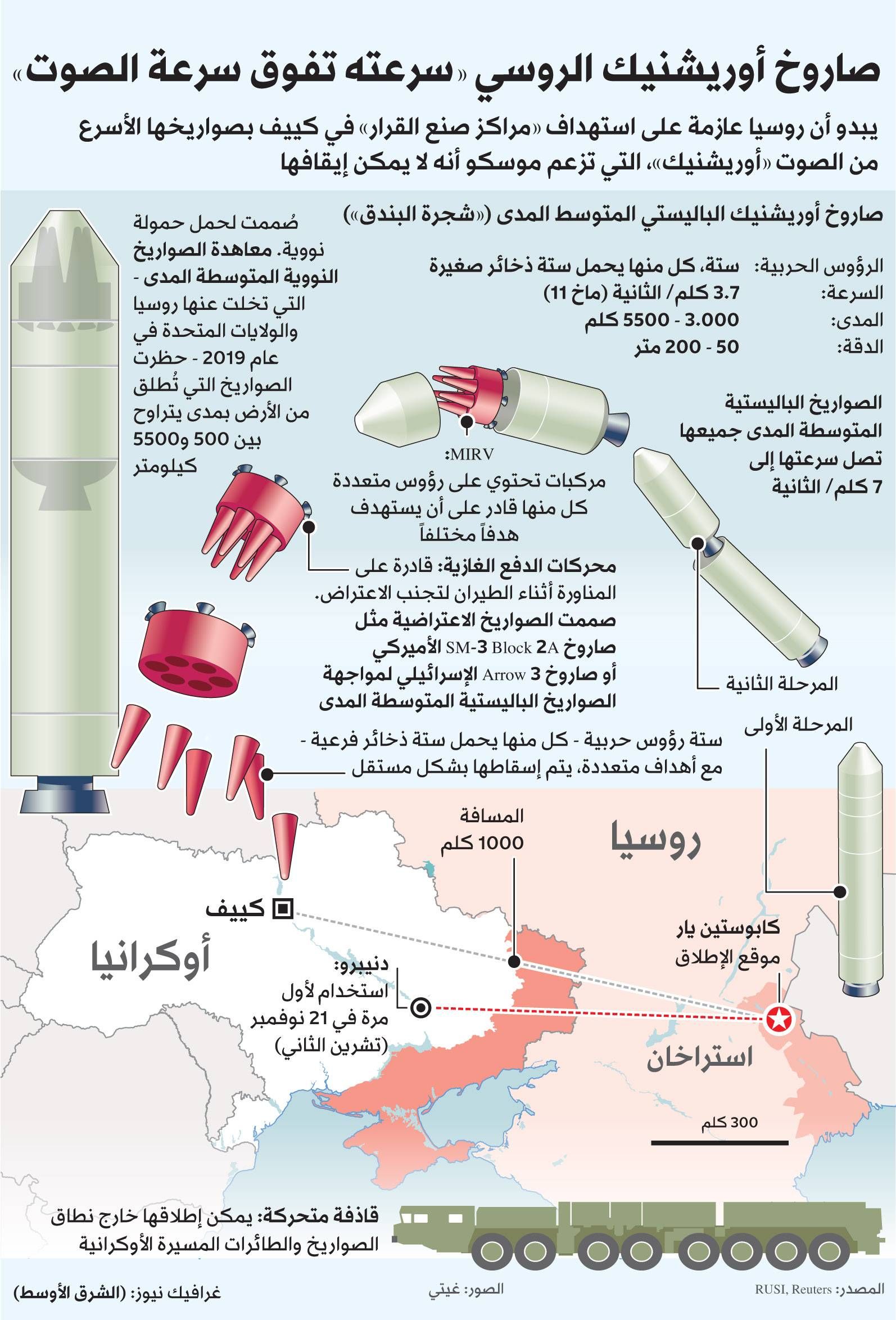 واستُخدم هذا السلاح القادر على ضرب أهداف تبعد آلاف الكيلومترات برؤوس نووية، لأول مرة برؤوس تقليدية عام 2024 ضد مدينة دنيبرو في وسط أوكرانيا الشرقي.