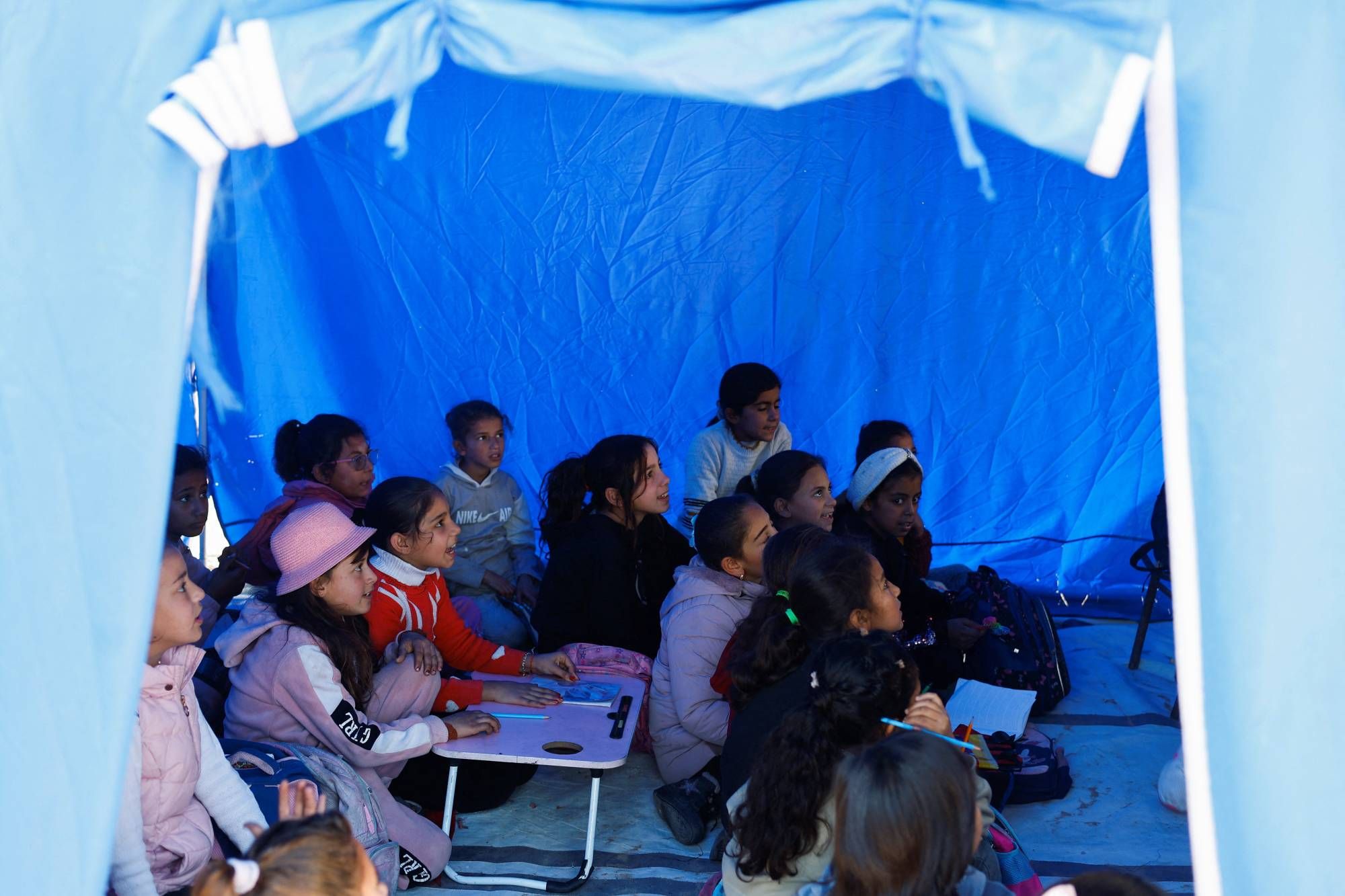 وتولين (سبع سنوات) واحدة من حوالي 400 طفل يتعلمون في «مدرسة الشمال التعليمية» المؤقتة التي أقيمت في خيام بلاستيكية زرقاء على أنقاض في بيت لاهيا في شمال قطاع غزة، وتقع على مرمى البصر من «الخط الأصفر» الذي تسيطر عليه القوات الإسرائيلية، وفق تقرير لوكالة «رويترز» للأنباء.