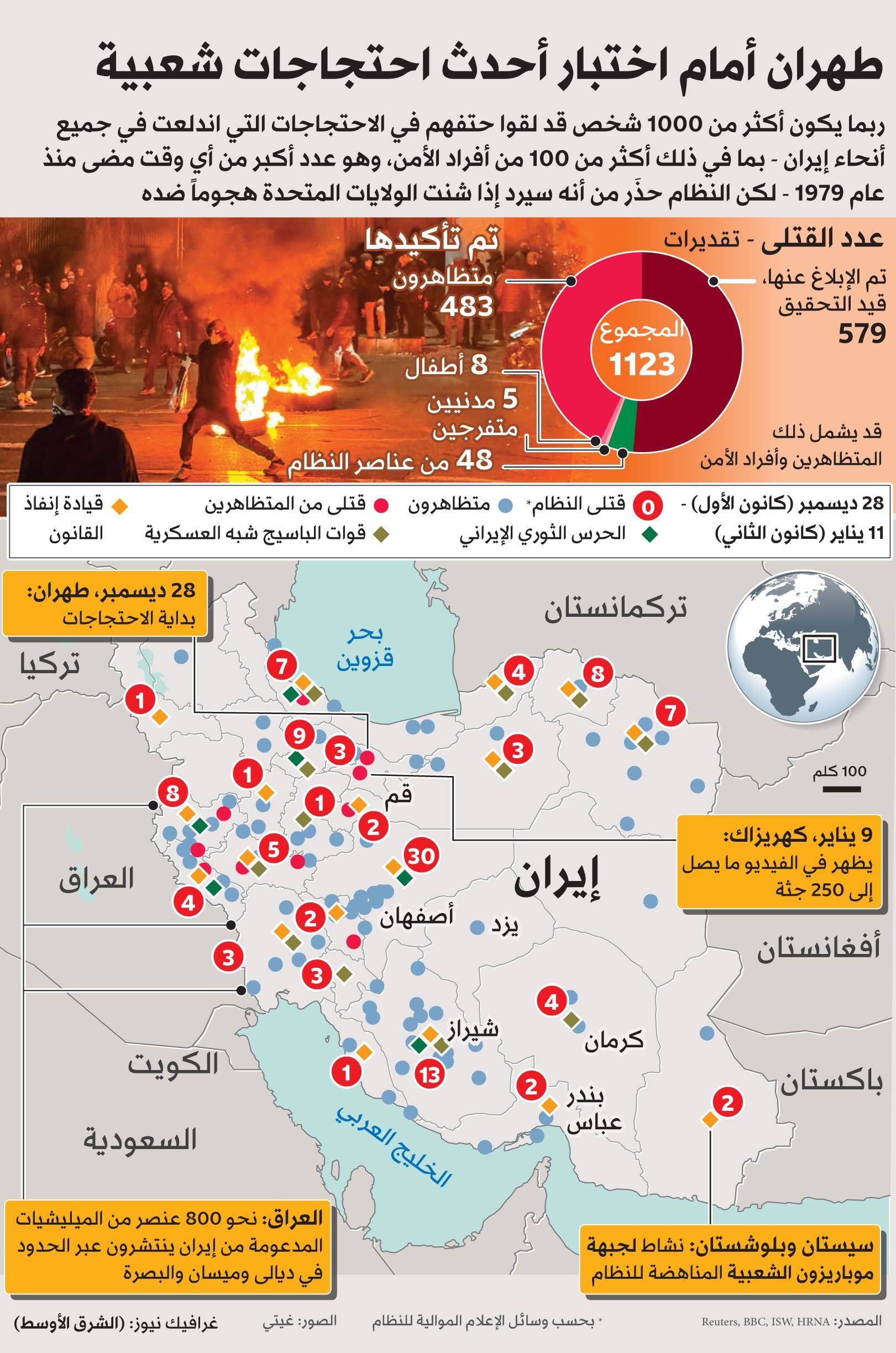 كانت منظمة حقوق الإنسان في إيران، ومقرها أوسلو، قد ذكرت، الاثنين، أن بعض التقديرات يشير إلى احتمال مقتل أكثر من ستة آلاف شخص. وقالت منظمات ومراكز أخرى إن مستشفيات عدة «ممتلئة» نتيجة تدفق المصابين وتراجع إمدادات الدم، مشيرة إلى أنها تأكدت من مقتل ما لا يقل عن 648 متظاهراً منذ بداية الاحتجاجات.
