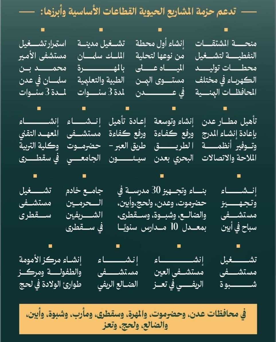 استبشار مجتمعيويشمل الدعم السعودي لمدينة عدن تشغيل مستشفى محمد بن سلمان لمدة ثلاث سنوات قادمة لرفع قدرات القطاع الصحي، وإعادة تأهيل مدرج مطار عدن وتزويده بأحدث أنظمة الملاحة والاتصالات لتعزيز حركة النقل الجوي، وإنشاء مدارس نموذجية لتحسين جودة التعليم، وتأهيل الطريق البحري والتقاطعات الرئيسية في المدينة.