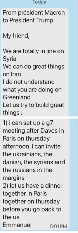 وقال ماكرون في رسالته: «صديقي، نحن متوافقون تماماً بشأن سوريا، ويمكننا أن نفعل أشياء عظيمة بشأن إيران»، مضيفاً: «لا أفهم ما الذي تفعله في غرينلاند. دعنا نحاول أن نبني أشياء عظيمة».