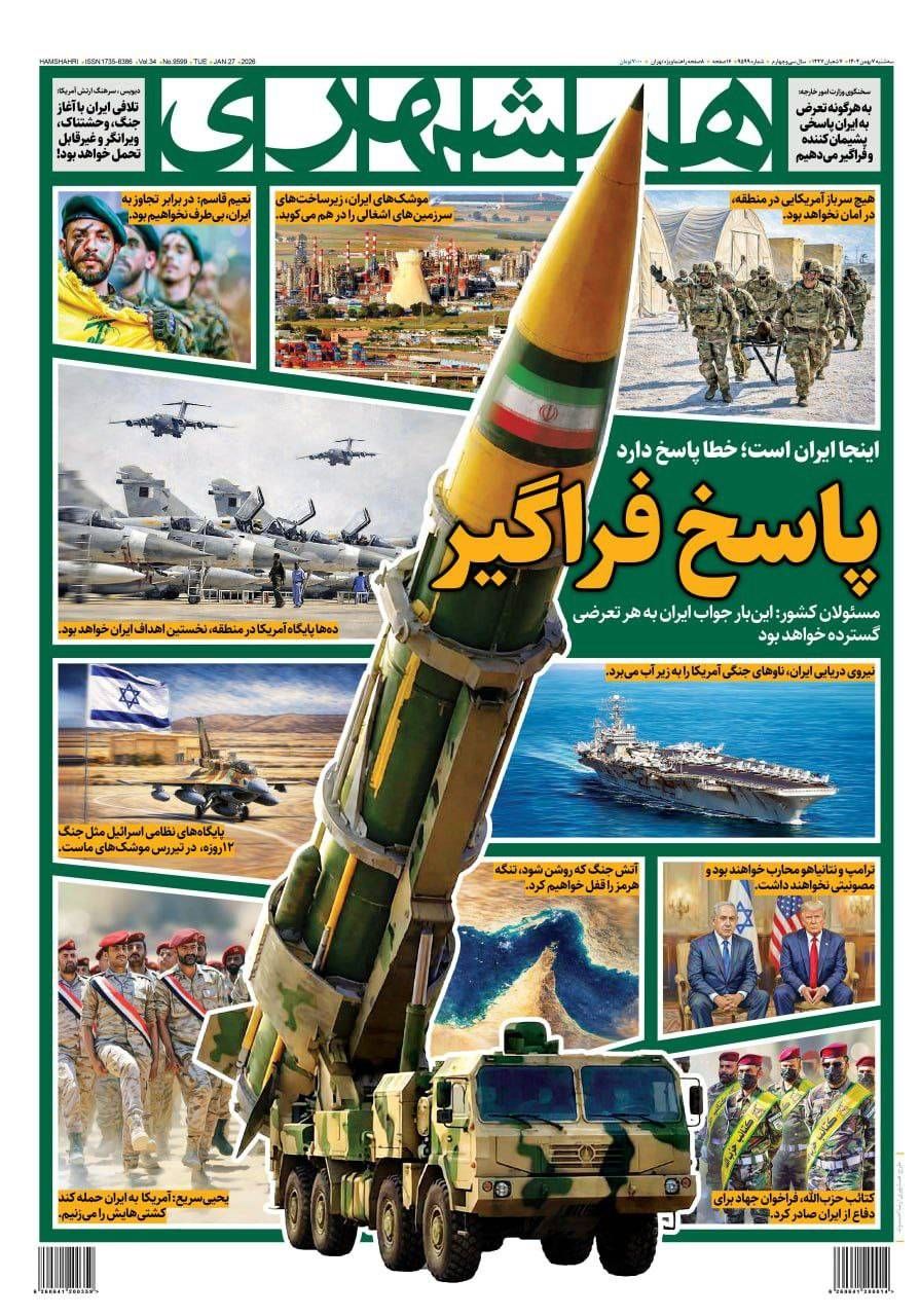 اخبار العرب -كندا 24: الثلاثاء 27 يناير 2026 11:39 صباحاً طهران تبقي جميع الخيارات مطروحة… وتهديد لترمب بـ«رصاصة الغيب»