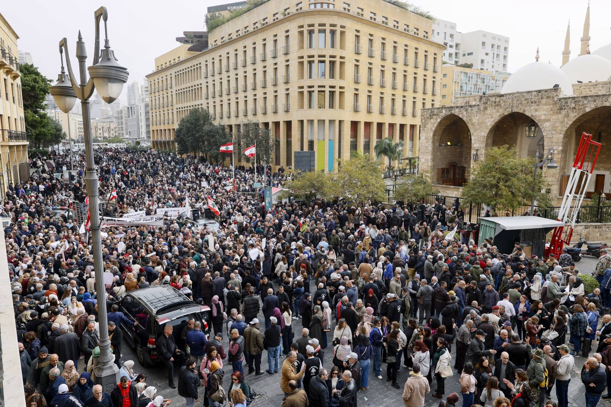 متقاعدون من القوى العسكرية وعاملون من القطاع العام يشاركون في تحرك بموازاة انعقاد جلسة البرلمان للمطالبة بتصحيح رواتبهم (إ.ب.أ)